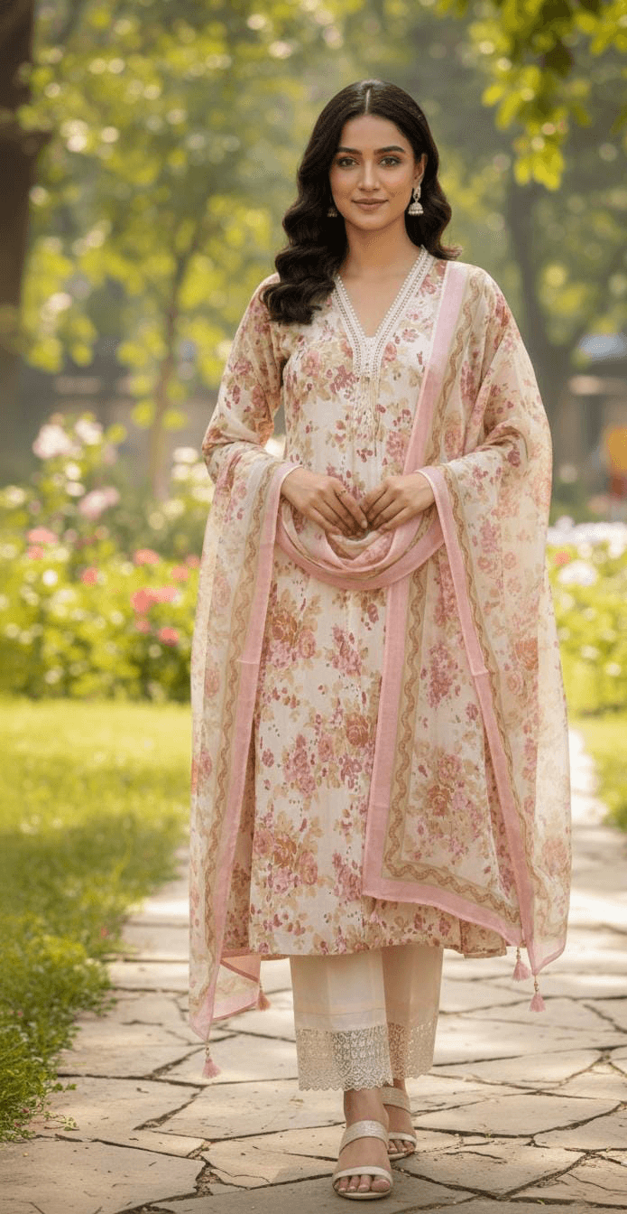 Step into a garden of elegance with this stunning Cream Floral Printed Salwar Kameez Set. This ensemble features a premium breathable fabric adorned with delicate pink and earth-toned rose motifs that exude a soft, feminine charm. The kurta is thoughtfully designed with a sophisticated V-neckline framed by intricate white lace detailing, which is mirrored at the sleeve cuffs and the hem of the matching straight-cut trousers. Complete with a sheer, lightweight dupatta that carries the same romantic floral print and lace borders, this outfit is the epitome of graceful daywear.